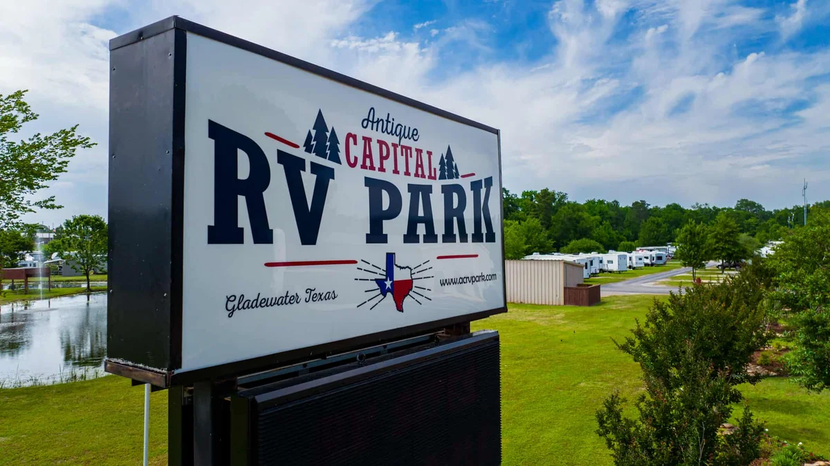 Antique Capital RV Park sits 120 miles east of Dallas in Gladewater, Texas. The park features a private fishing lake and over 100 full-hookup sites.