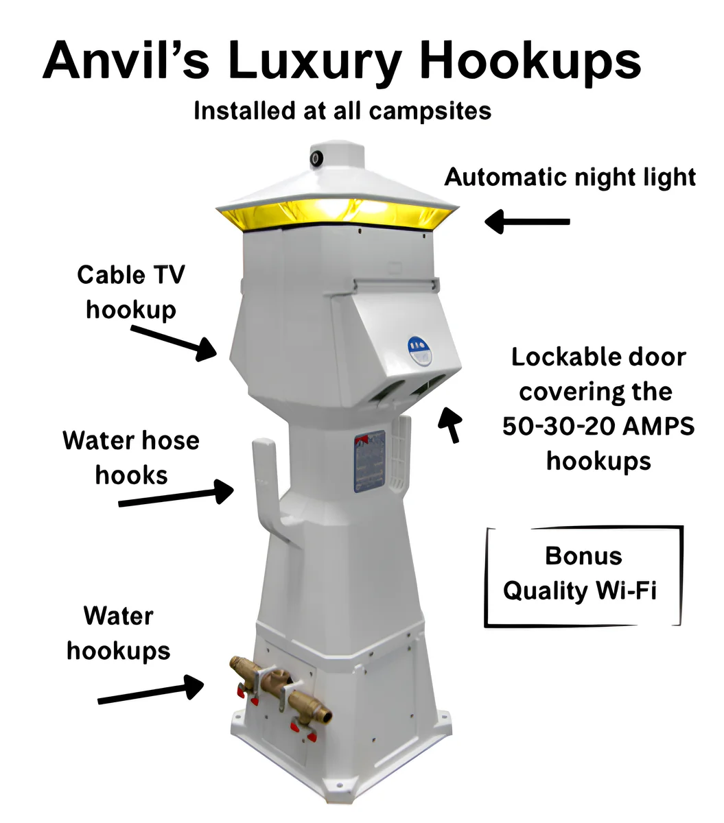 Anvil Campgrounds operates as a fourth-generation family business since 1954. The park offers 120 sites with full hookups including 50/30/20 amp electric. Every site includes water, sewer, cable TV, and WiFi.