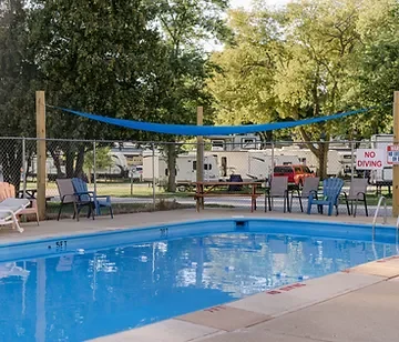 On-site recreation includes a heated swimming pool, a playground, and fire rings for campfires. The park hosts seasonal events and group gatherings.