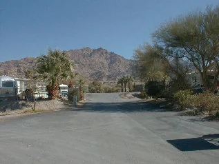 The campground sits on a flat, gravel lot with shade trees. Each site includes a picnic table. The resort attracts snowbirds from November to March.