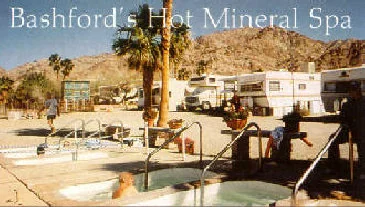 Bashford's Hot Mineral Spa in Niland, California, 120 miles east of San Diego, pipes 104ยฐF natural mineral water into its soaking pools. This desert oasis provides year-round access to therapeutic pools and RV sites with full hookups.