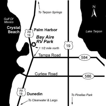 Bay Aire RV Park is a 55+ gated RV community in Palm Harbor, Florida, 30 miles west of Tampa. This park places residents close to Gulf Coast beaches and the Pinellas Trail.