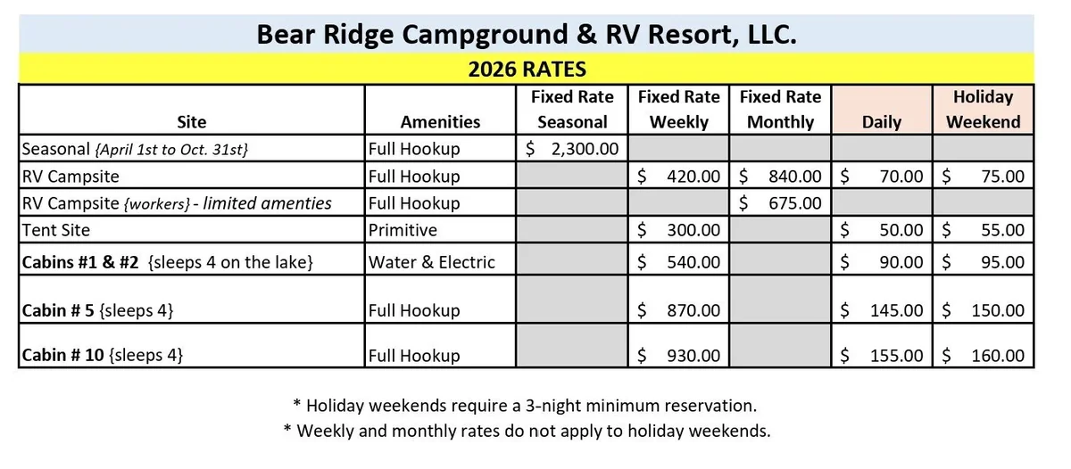 Rates are not published online. Nightly or weekly rates vary by season, site type, and accommodation (RV site or cabin). Contact the campground for current pricing, deposit requirements, and any discounts for extended stays.