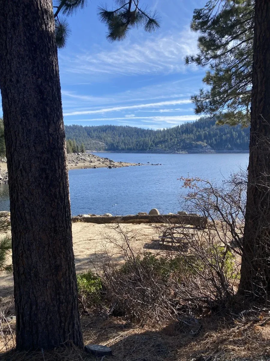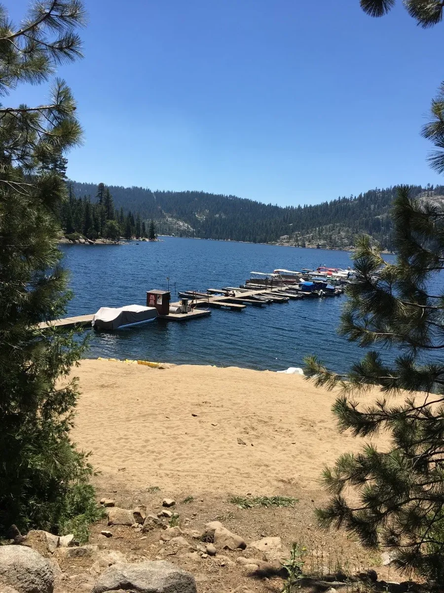 Bear River Lake Resort sits on Bear River Reservoir at 6,000 feet elevation. It opens early in the season for lakeside camping 80 miles east of Sacramento.