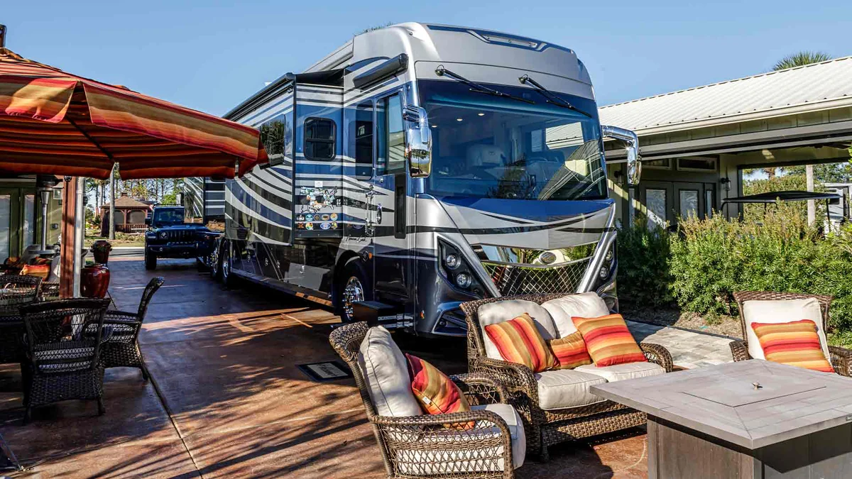 Bella Terra Luxury RV Resort ranks among the top 10 RV resorts in the nation every year since 2008. The resort accepts Class A and Super C motorcoaches only. Oversized RV lots include covered patios, screened-in gazebos, pergolas, full kitchens, firepits, and multiple seating options.