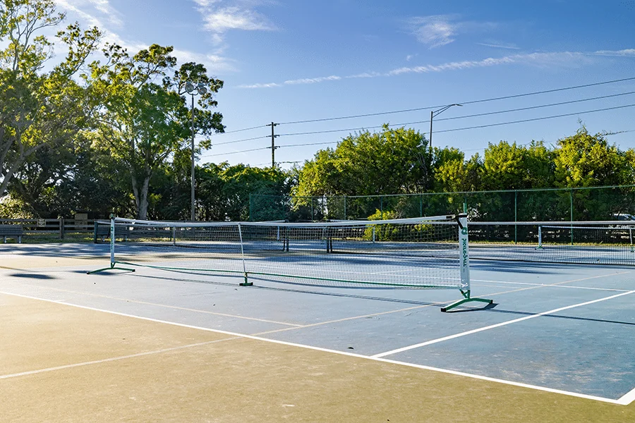 Guests enjoy access to a resort-style pool and jacuzzi, multiple sports courts for pickleball and tennis, two clubhouses for socializing, a movie theater, and organized activities including bingo and dog walking.