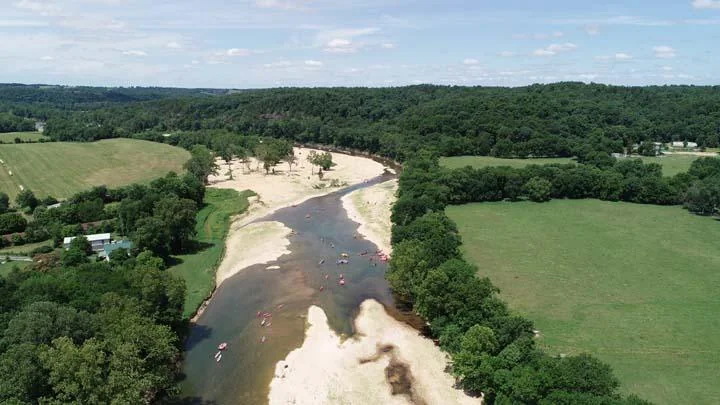 Big Elk Camp & Canoe Rentals offers a campground store selling supplies, a volleyball court, and large sandy beaches along the riverbank.
