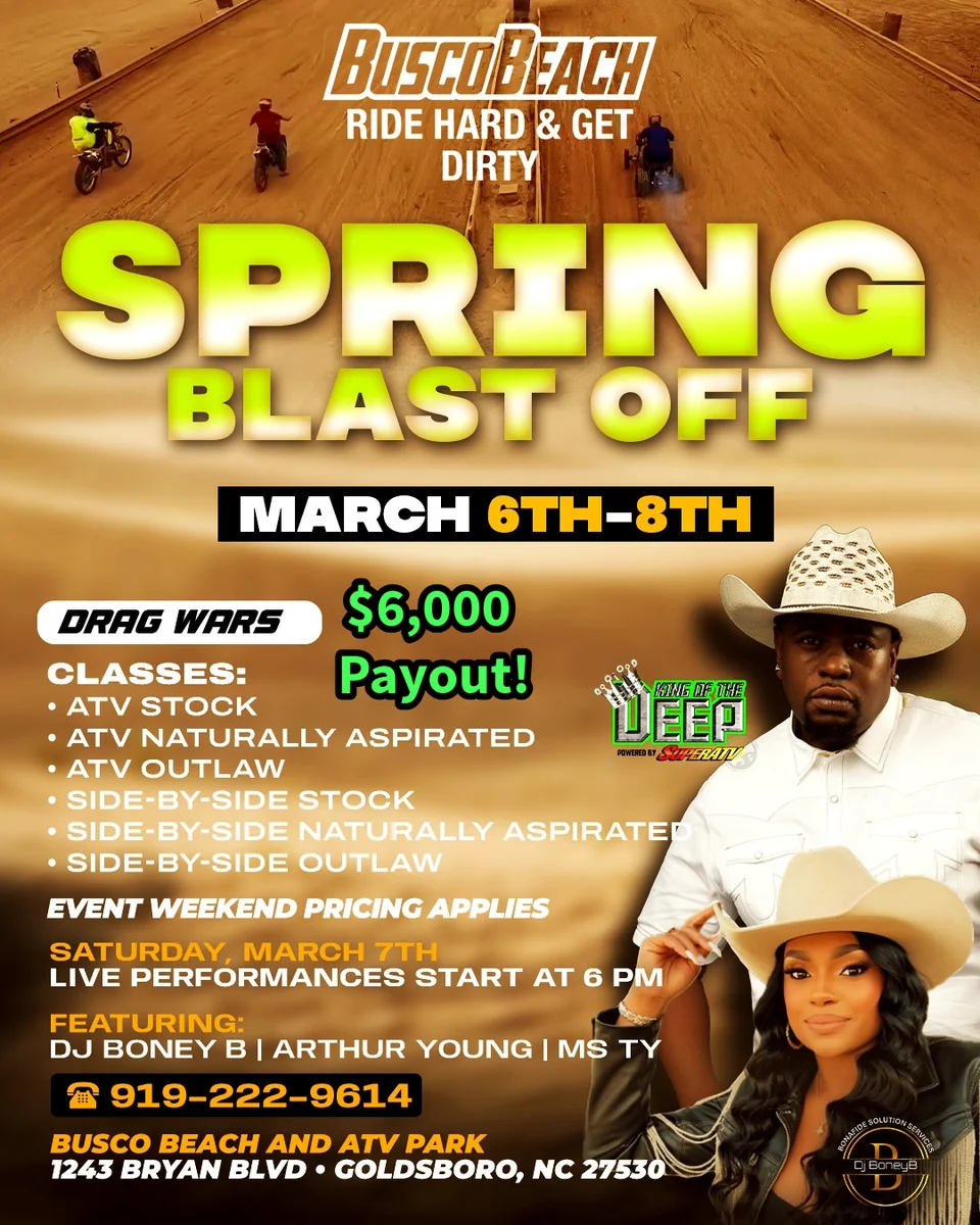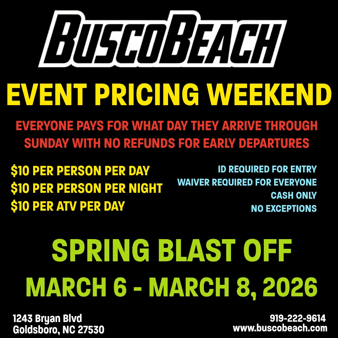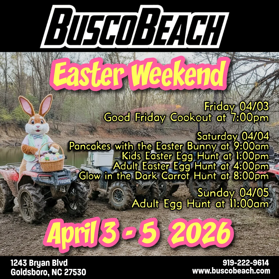 Busco Beach & ATV Park is a 2,000-acre off-road and water sports complex in Goldsboro, North Carolina, 50 miles southeast of Raleigh. This recreational facility features a manmade beach, multiple specialized riding tracks, and 24/7 access for camping and riding.