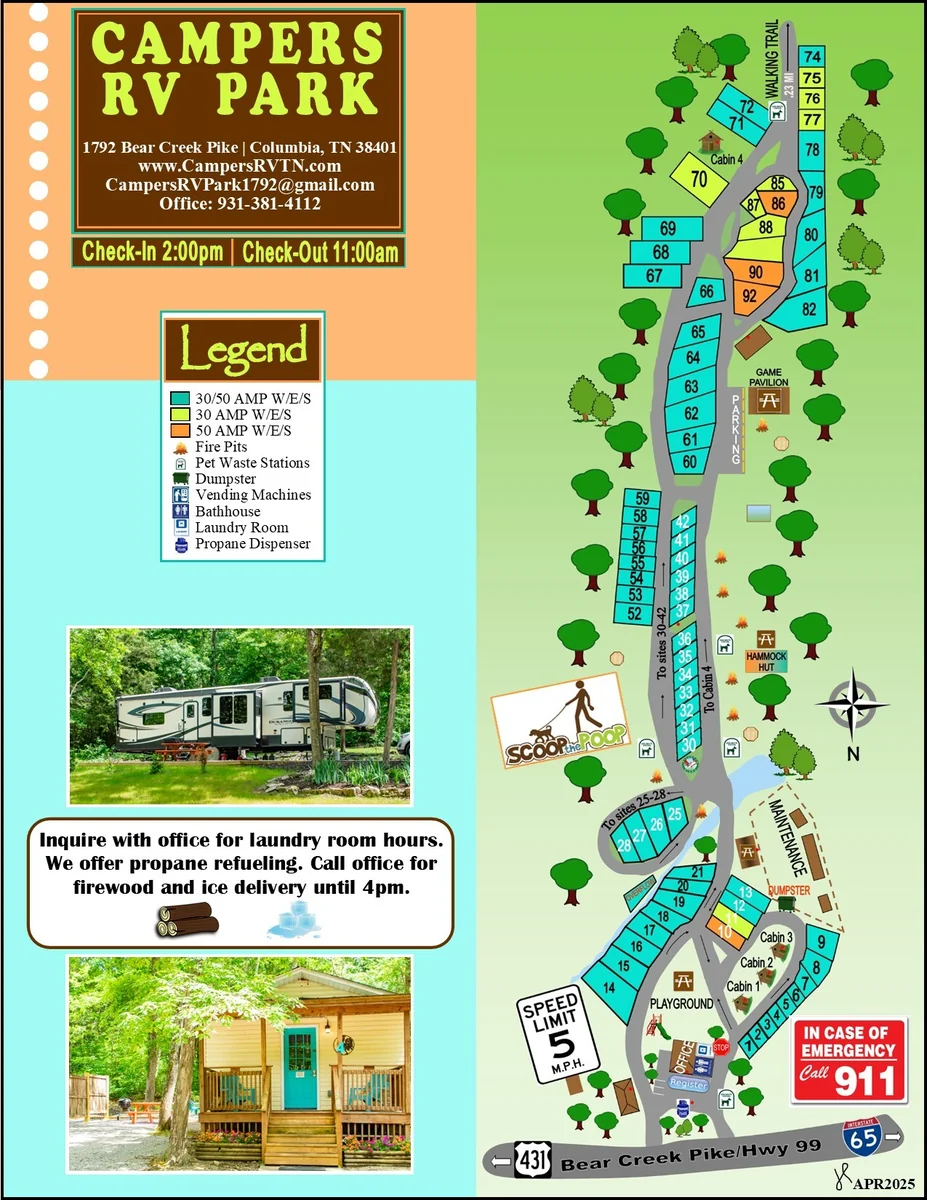 Camper's RV Park sits in Columbia, Tennessee, 45 minutes south of Nashville. This gated park features all pull-through, full-hookup sites with patio tables.