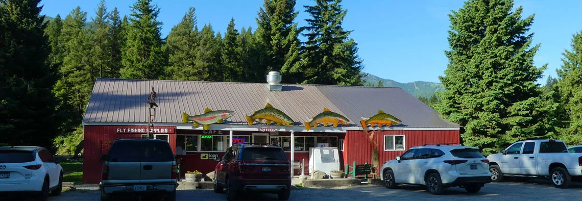 The resort provides guest laundry, private showers, the Campfire Lodge Cafe, and an on-site fly shop. The cafe serves breakfast and lunch daily during the operating season.