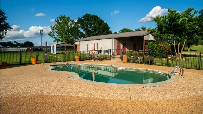 Guests choose between pull-through and back-in sites on compacted gravel pads. The park maintains a quiet atmosphere for short-term and long-term guests. A seasonal swimming pool and BBQ area provide outdoor recreation.
