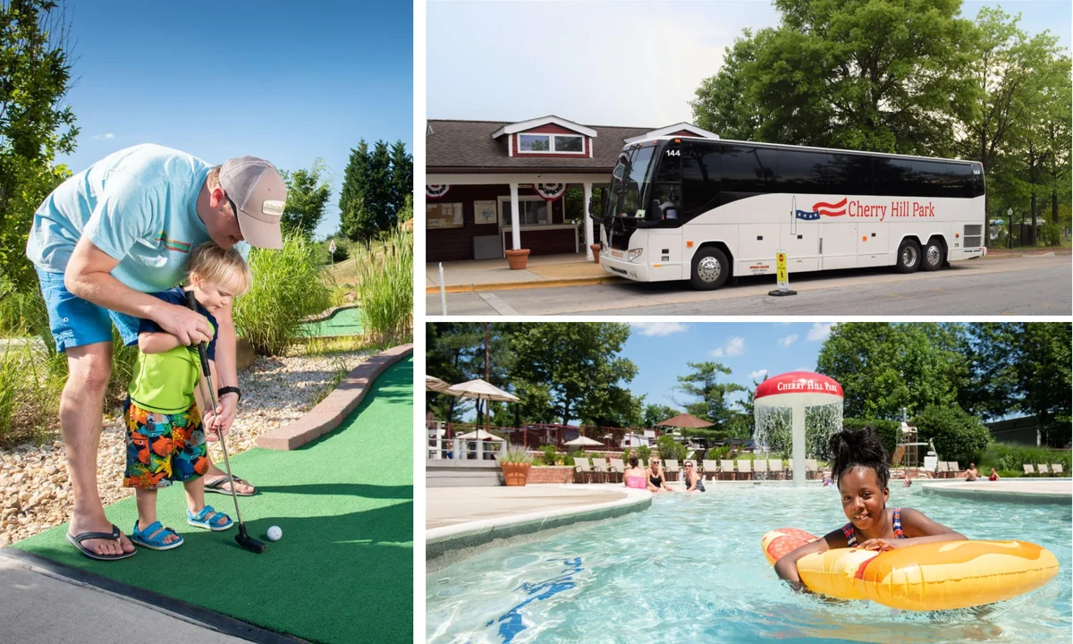 Cherry Hill Park operates year-round as a family-owned resort since 1921. The park sits 9 miles north of the National Mall. A private bus depot transports guests to the Smithsonian Metro station.