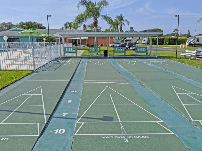 The community features a shuffleboard court and a clubhouse for social events. The resort plans activities for guests and long-term residents throughout the year.