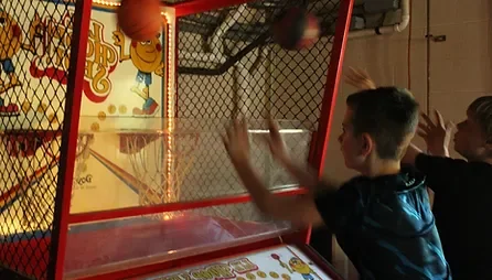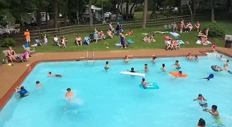 The campground includes a swimming pool, playground, scheduled family activities, camp store, laundry facility, and bathhouses with hot showers. Recreational amenities include a basketball court, game room, and fishing in the on-site creek.