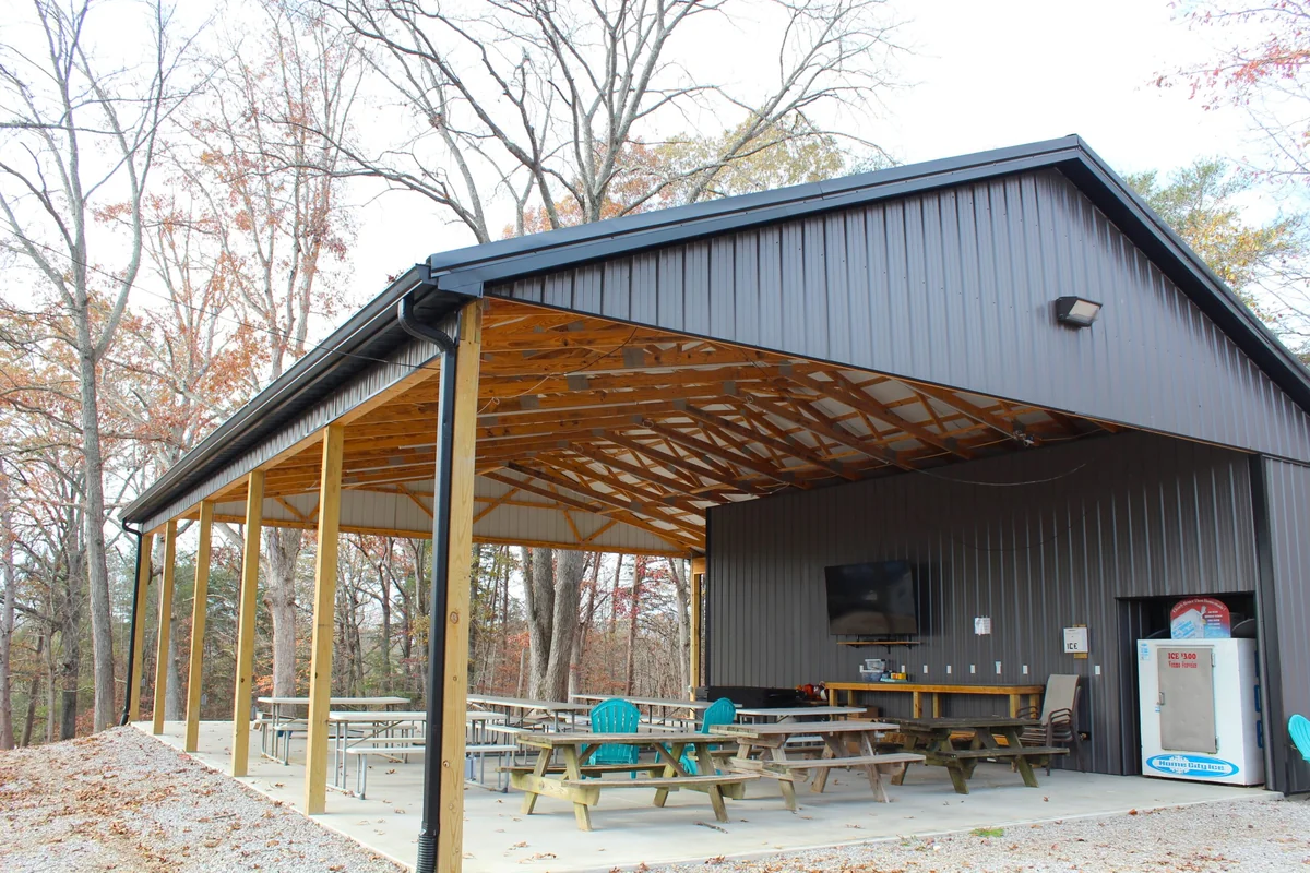 A catch-and-release pond provides on-site fishing. Walking trails wind through the wooded property. Boat storage serves guests exploring Lake Cumberland.