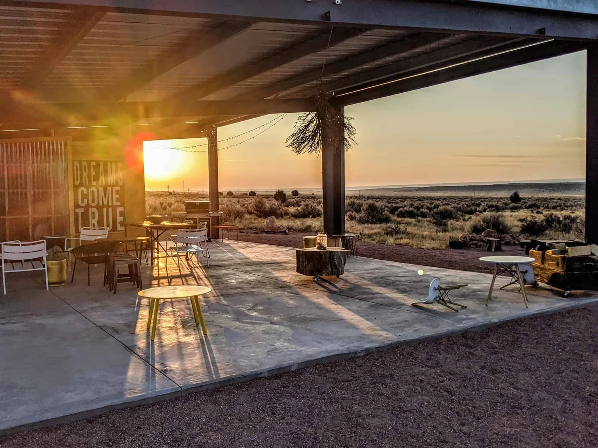 The Texas-shaped fire pit hosts cookouts and marshmallow roasts. Benches face the adjacent pasture for watching cattle graze. The horseshoe pit provides additional on-site recreation.
