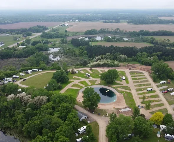 The campground sits near the Chain O' Lakes in central Wisconsin. A pond and beach provide on-site water access for guests. Pets must stay on leashes and remain away from the pond and beach.