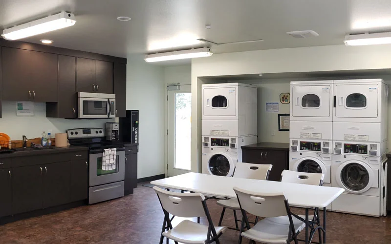 Elwha Dam RV Park amenities include free fiber optic WiFi, clean modern restrooms with hot showers, a coin-operated laundry facility, and a gift shop. The property also features a guest clubhouse, a BBQ pavilion, picnic tables, fire rings, and a community garden with hydroponics.
