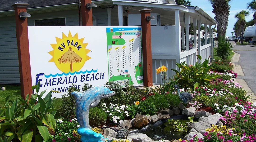Emerald Beach RV Park sits on Santa Rosa Sound in Navarre, Florida. This waterfront campground features a private sandy beach and a 300-foot pier.