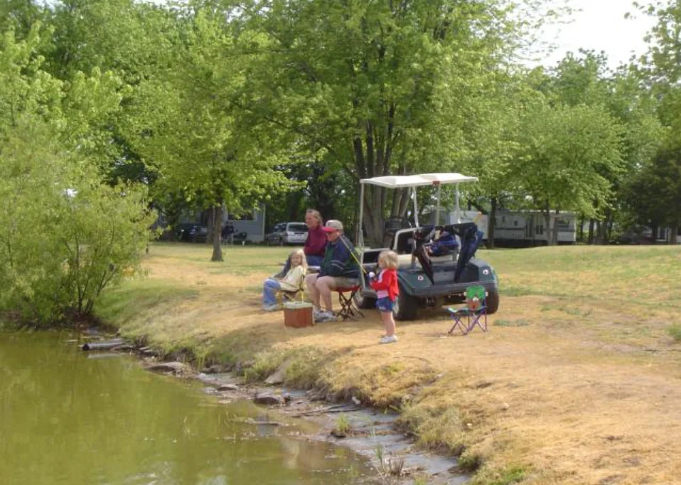 On-site recreation includes a swimming pool, fishing pond, and sports courts. The resort hosts planned activities on weekends during the summer season, including potlucks, games, and holiday events.