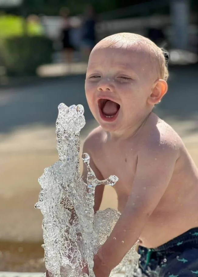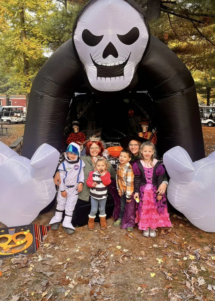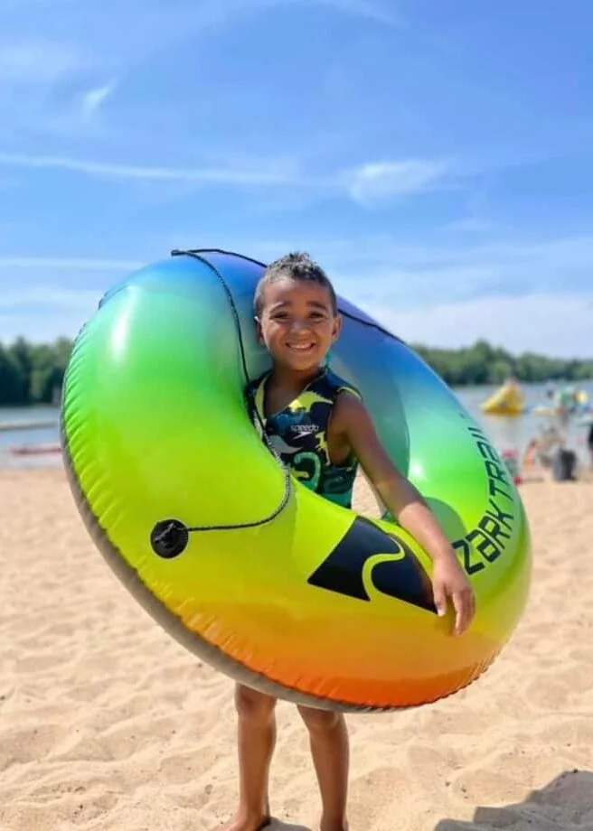 An on-site water park features a heated swimming pool, a large water slide, and a splash pad. The Chippy Express train and inflatable play structures entertain children. Kayaking, mini-golf, basketball, and volleyball fill the recreation schedule.