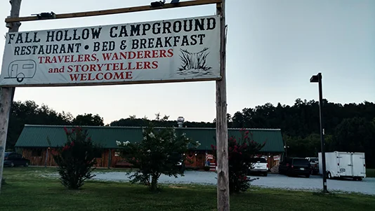 Fall Hallow Village is a rustic campground on 30 private acres along Big Swan Creek in Hohenwald, Tennessee, 90 minutes southwest of Nashville.