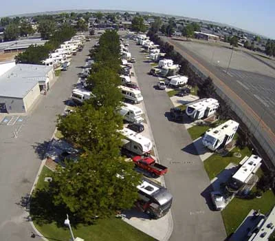 The campground accommodates a mix of overnight travelers and monthly residents in a quiet, gated setting. The location is removed from highway noise but within walking distance of several restaurants and services.