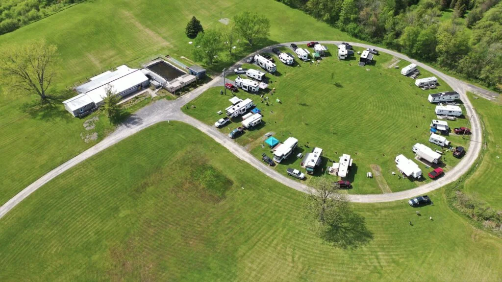 Electrical service includes both 30-amp and 50-amp options. The recreation hall houses a full-service bar, billiards, darts, and a dance floor. The property sits 20 minutes from the north end of Cayuga Lake.