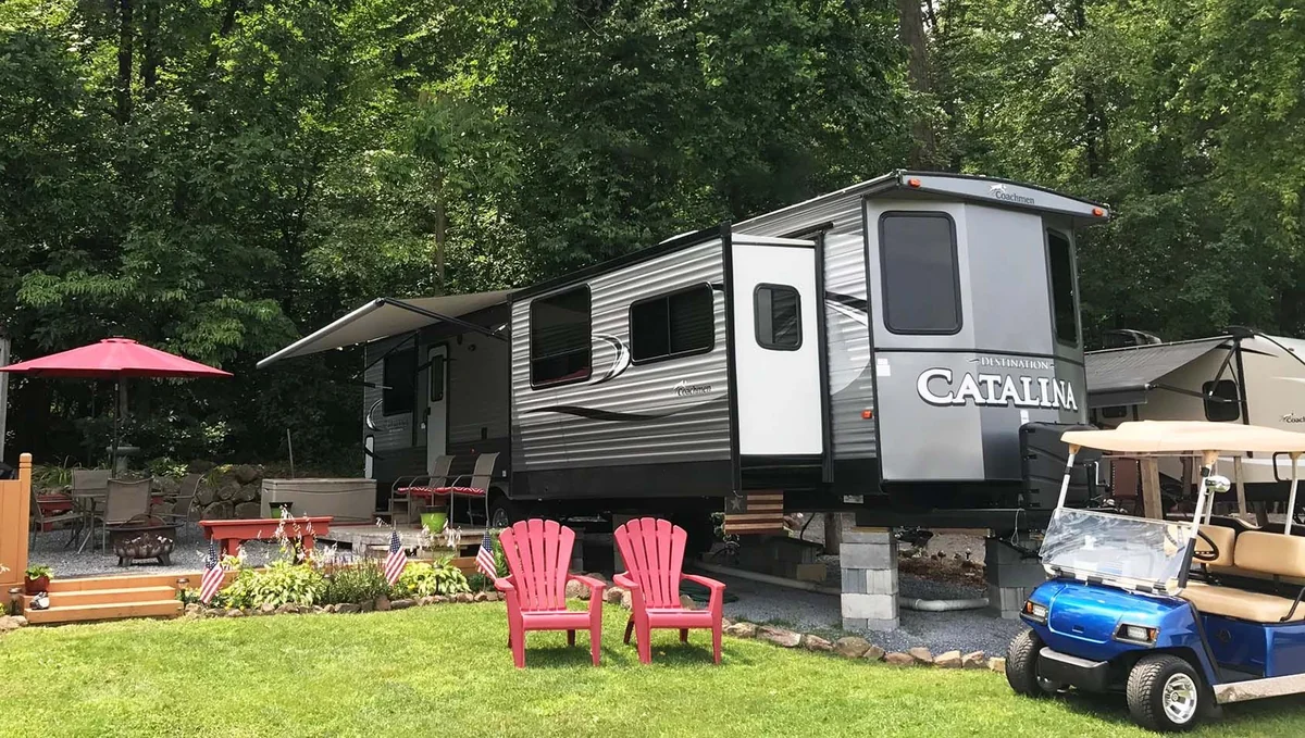 A creek runs through the property for fishing. The campground schedules themed weekends and holiday celebrations. The property sits 5 miles from the Pennsylvania Turnpike.