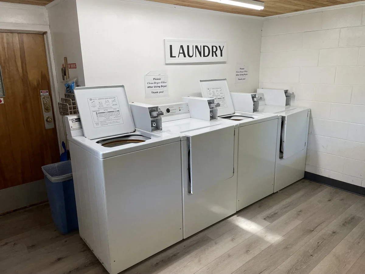 Amenities include 24/7 shower and laundry facilities, a camp store, a game room with pool and ping-pong tables, a dog park, restrooms, and walking trails.