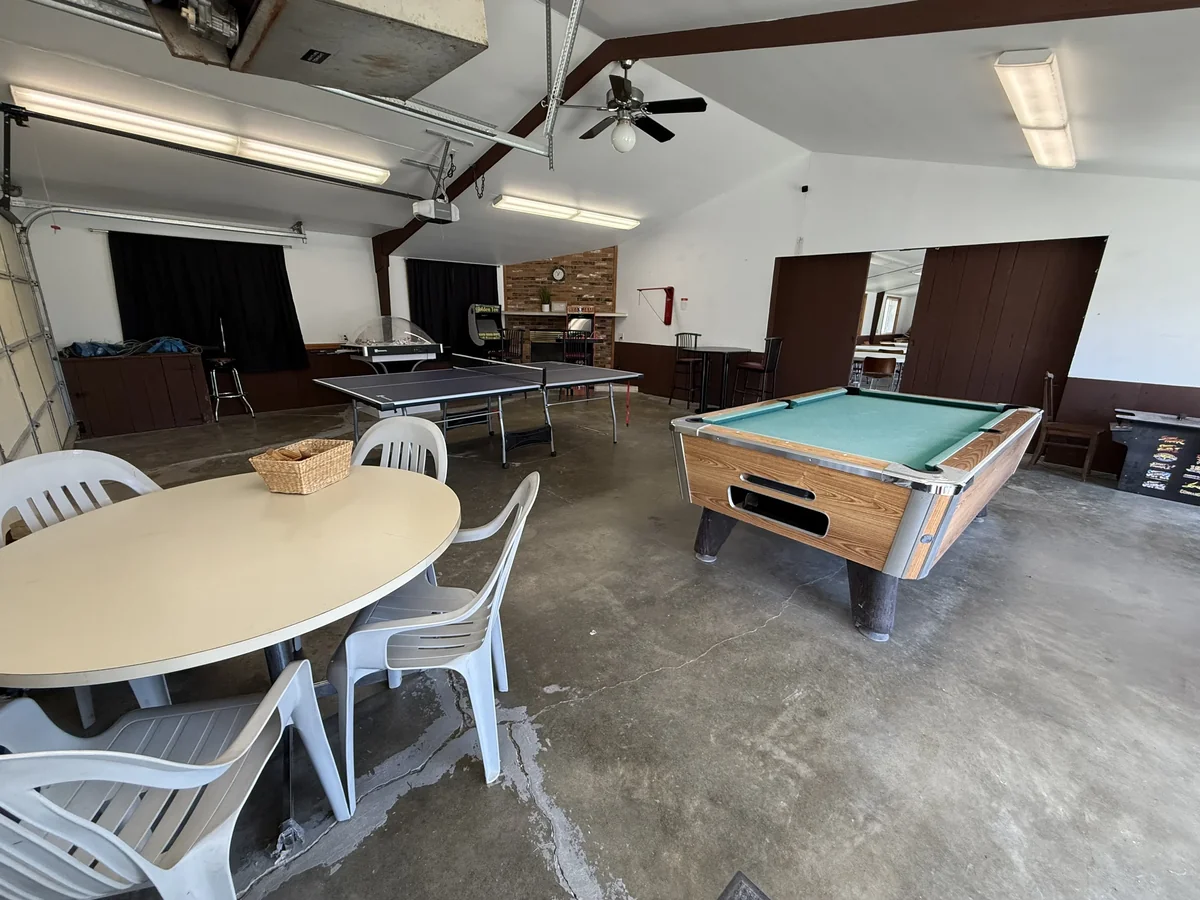 Direct river access allows fishing and kayaking from the property. The park offers a game room with pool, ping pong, and arcade games. Outdoor recreation includes giant Jenga, bean bag toss, and horseshoes.