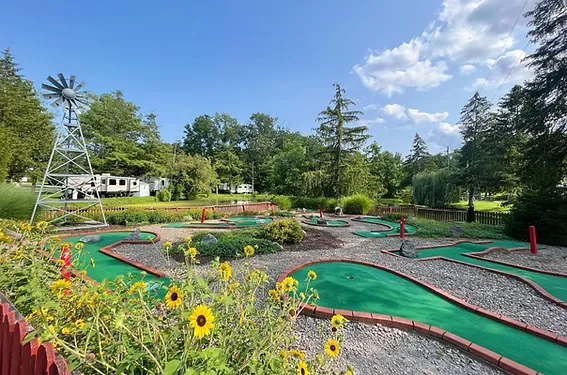An 18-hole mini golf course operates on the property. A ceramic workshop offers hands-on activities for guests. Weekly activities include bingo, crafts, and outdoor movies.