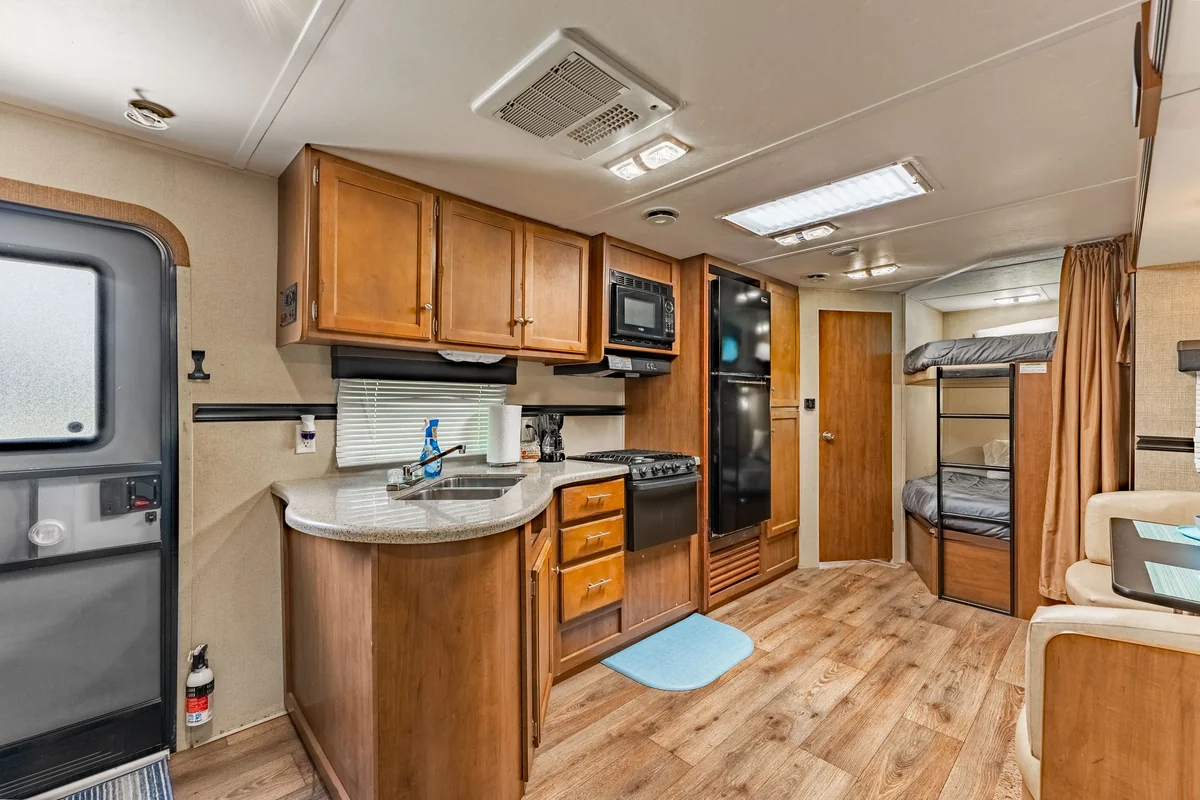 RV rentals cost $100 per day for guests without an RV. Monthly rates require a phone call for current pricing. Reservations are available online through the park's booking partner.