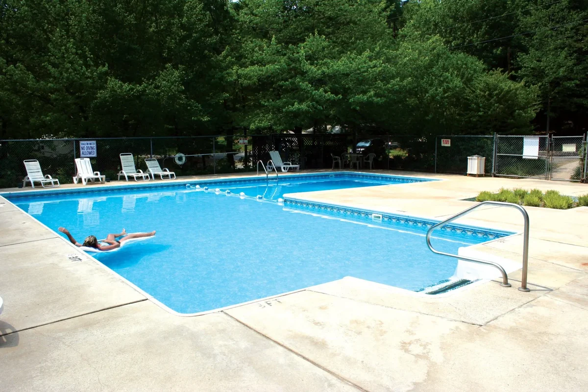 The campground's amenities include a seasonal swimming pool, a seasonal snack bar, a propane refill station, and a laundry room. Guests have access to cable TV connections at their sites and a dump station for waste disposal.