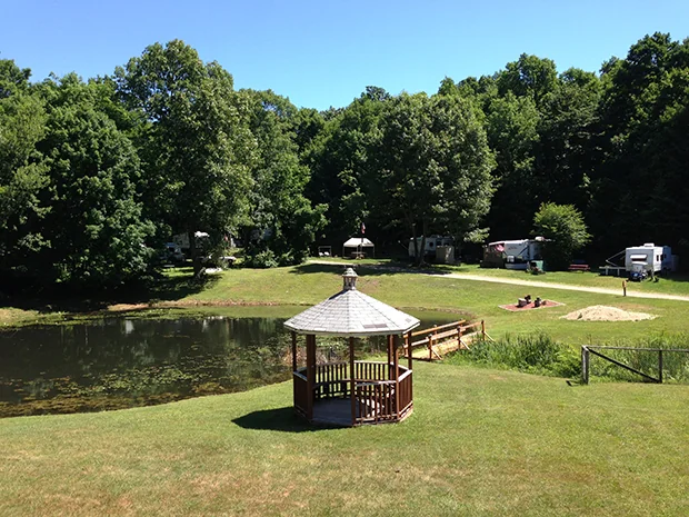 A stocked fishing pond provides on-site fishing opportunities. Planned activities run every weekend with sports and games. The property requires reservation holders to be age 21 or older.