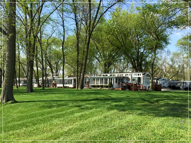 Seasonal lot fees start at $8,550 for the period from April 1 to October 31. This fee includes the private waterfront site, boat slip, weekly grounds maintenance, weekly septic service, garbage removal, water, and access to all park amenities and community activities.