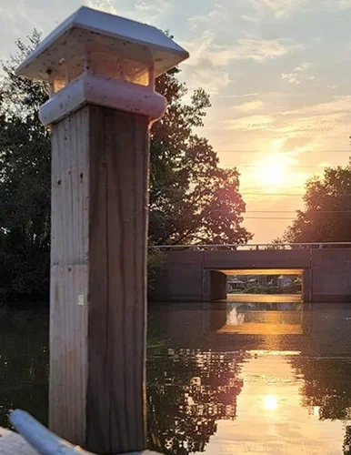 Island On The Chain offers seasonal camping from April 1 through October 31. The park leases waterfront sites for park model homes only. Each site includes a private 50-foot waterfront lot with a boat slip on a private pier.