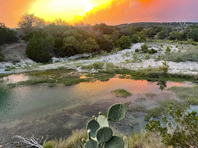 The mature pecan orchard provides consistent shade. A catch-and-release fishing creek runs along the resort's perimeter. Wildlife sightings include deer throughout the property.