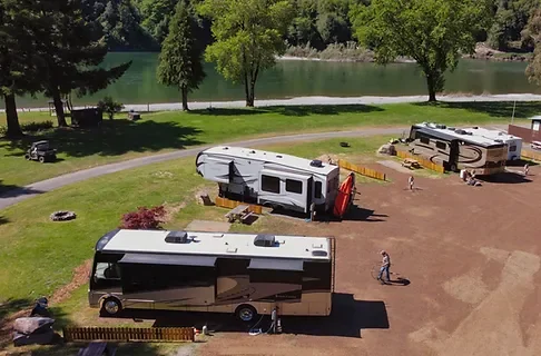 Kimball Creek Bend RV Resort sits on the Rogue River in Gold Beach, Oregon. The park provides direct river access for fishing and boating.