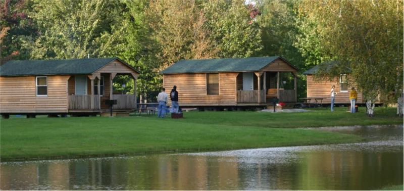Full-hookup RV sites start at $44 per night for two adults, with additional adults charged $8 per person nightly. Primitive tent sites cost $28 per night, and rental cabins range from $110 to $165 per night depending on size and amenities. The campground applies a 10% discount for stays of seven nights or longer.