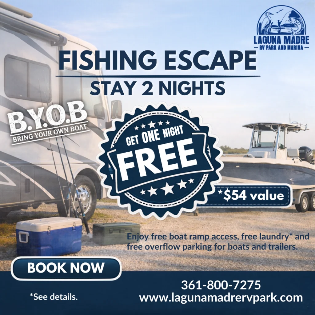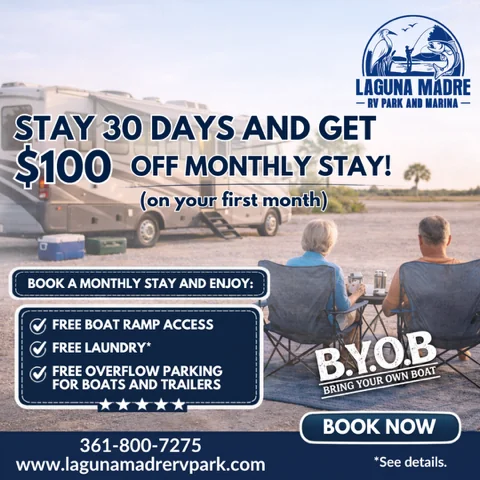 Laguna Shore Village sits on Laguna Madre Bay in Corpus Christi, Texas. The park provides 59 concrete RV pads and a private boat ramp for bay access.