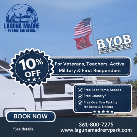 Laguna Shore Village places 59 concrete RV pads on Laguna Madre Bay. The park sits 10 miles from downtown Corpus Christi. The location lies 12 miles from Padre Island National Seashore.