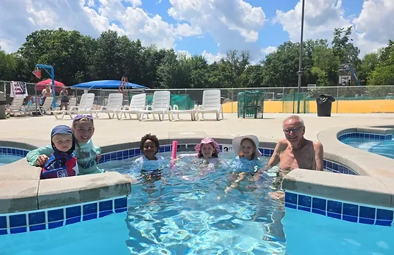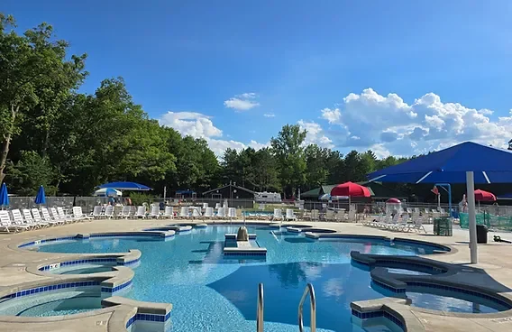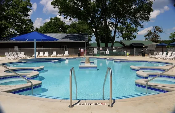 Lake Arrowhead Campground runs three swimming pools: a main pool, a kiddie pool, and a lounging pool. The campground offers RV sites, tent sites, deluxe cabins, and glamping rentals. On-site recreation includes a jumping pillow, sand volleyball, basketball, and fishing.