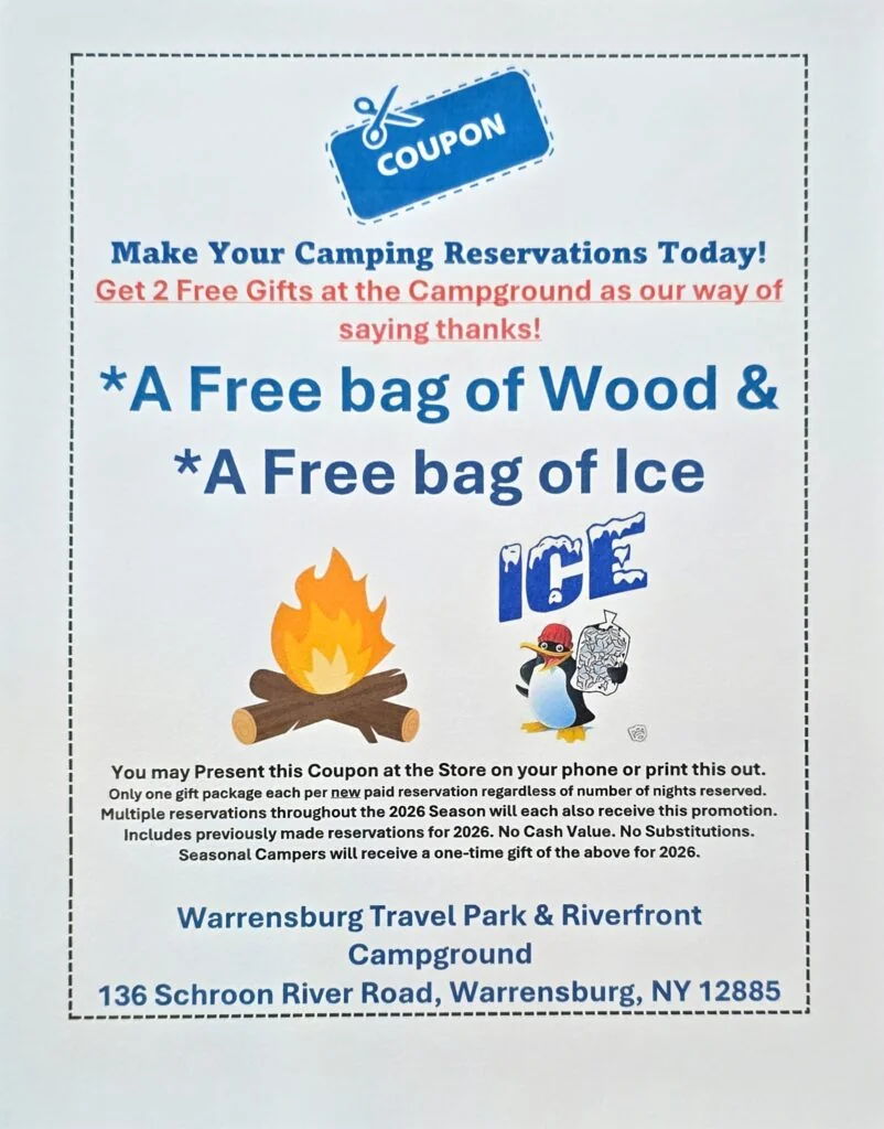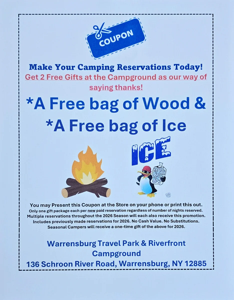 Amenities include a heated inground pool, clean restrooms with hot showers, a laundry room, a game room, a camp store, and free WiFi. The campground provides picnic tables and firewood at each site.