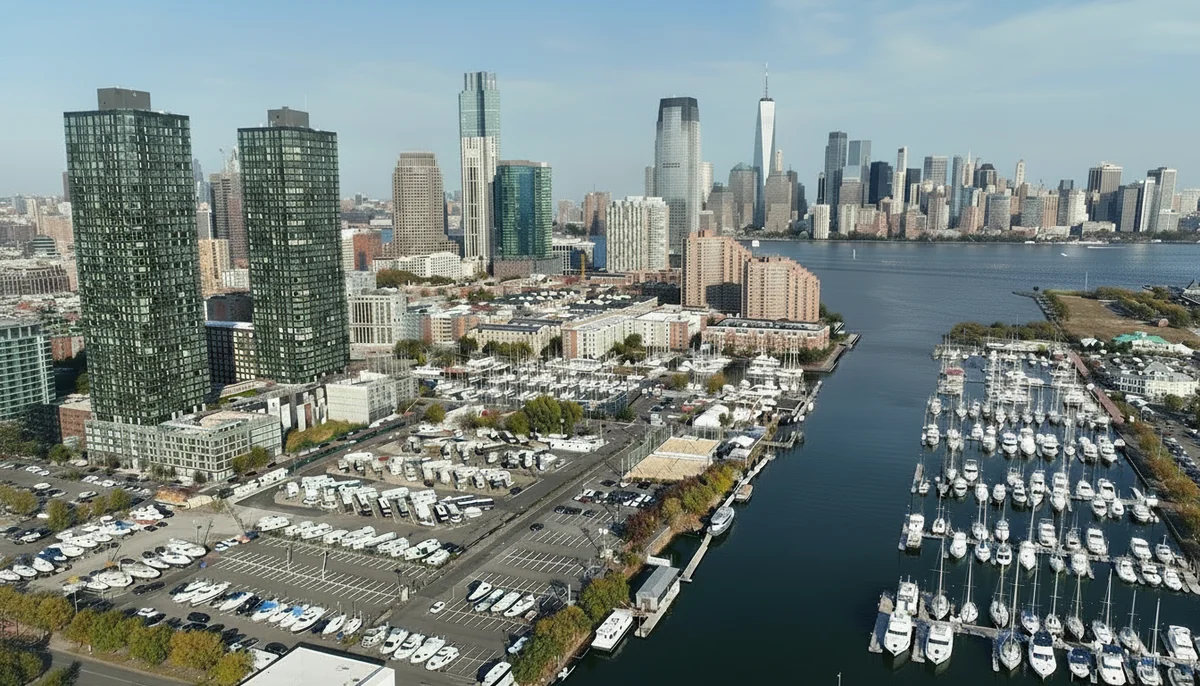 The park lies a 12-minute PATH train ride from Manhattan. Liberty State Park and the Statue of Liberty ferry are within walking distance. Waterfront views from the adjacent marina define the park's setting.
