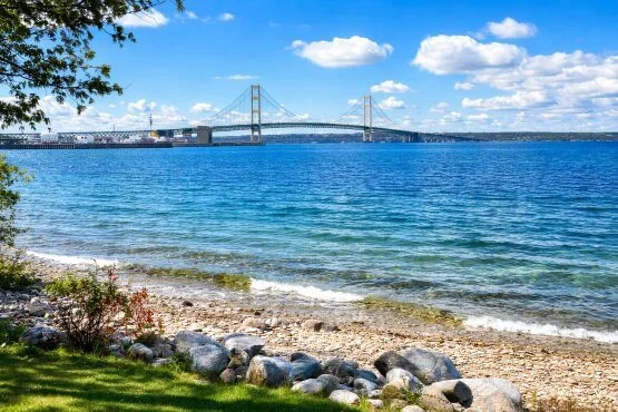 Mackinaw Mill Creek Camping sits on a mile of Lake Huron shoreline in Mackinaw City, Michigan. The campground offers direct views of the Mackinac Bridge and Mackinac Island.