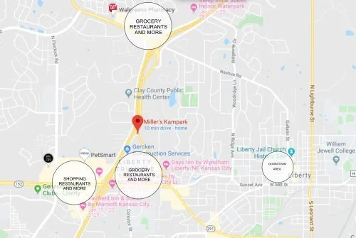 Miller's Kampark is a family-owned extended-stay RV park in Liberty, Missouri, 10 miles north of downtown Kansas City. The park offers 56 full-hookup sites with 30/50-amp service.