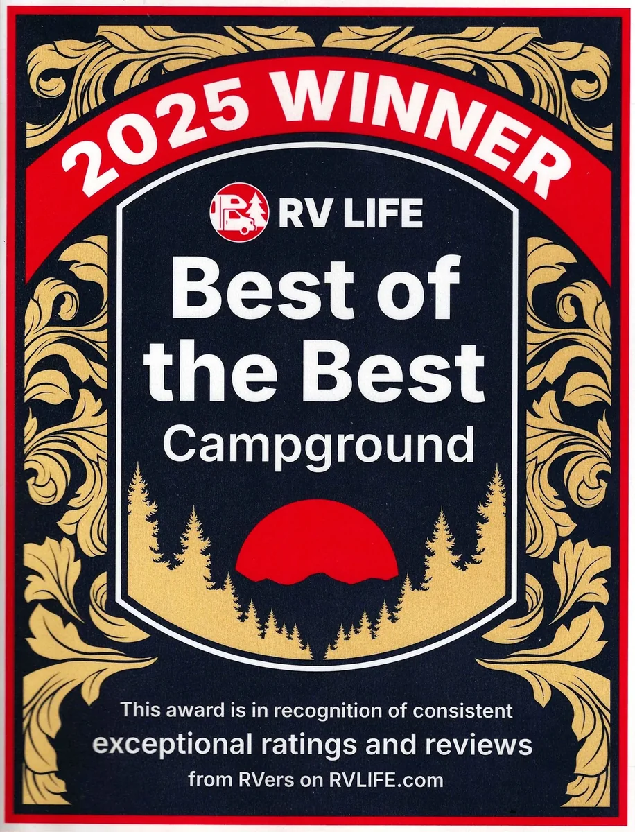On-site recreation includes an activity room with a pool table. The park offers cornhole courts, a basketball court, and horseshoe pits. A playground and dog park provide additional outdoor options.