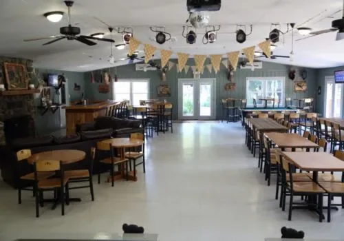 A two-acre fishing pond holds catfish, bass, and bluegill. The recreational building seats 250 people for banquets and events. The resort schedules live music, dances, and hayrides from spring through fall.