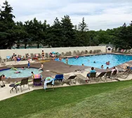 Mt Pocono Campground amenities include free WiFi, two heated swimming pools, and an on-site dog run. Full hookup sites include cable TV access. The campground office sells discounted tickets for Pocono Whitewater rafting.